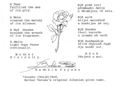 The poem and lullaby below was lovingly written by Bashkim in memory of his mother, Drita, and Mother Teresa.